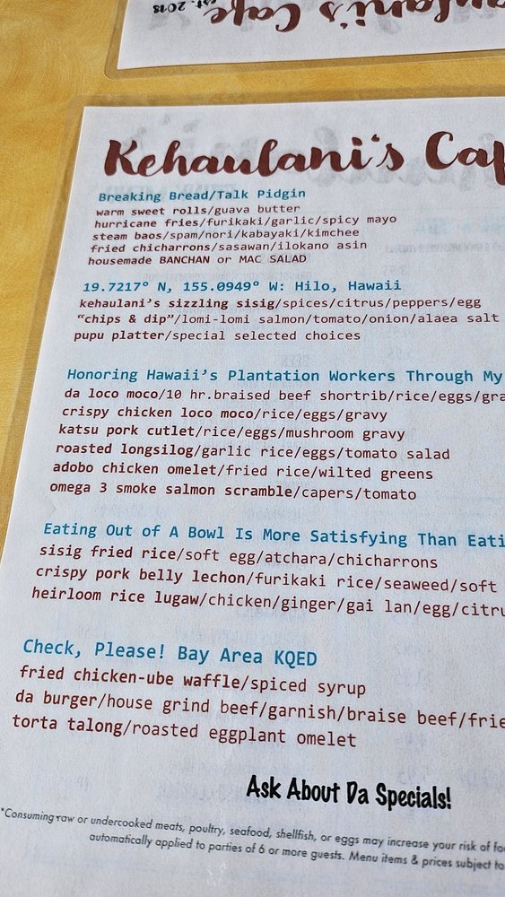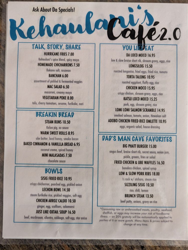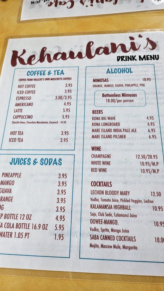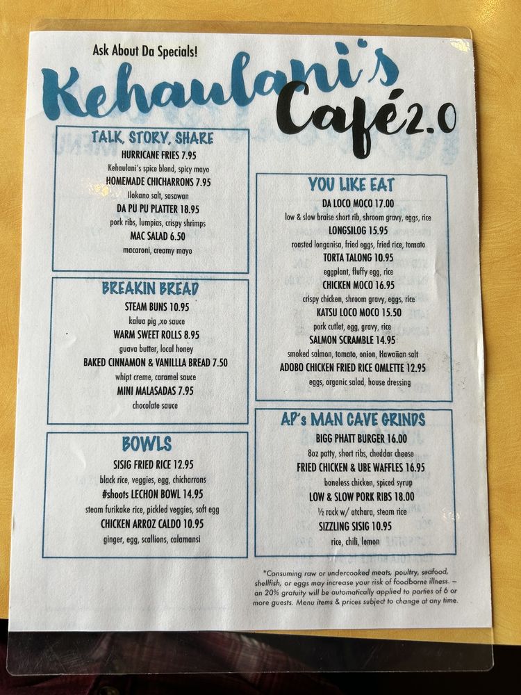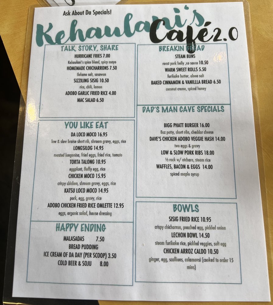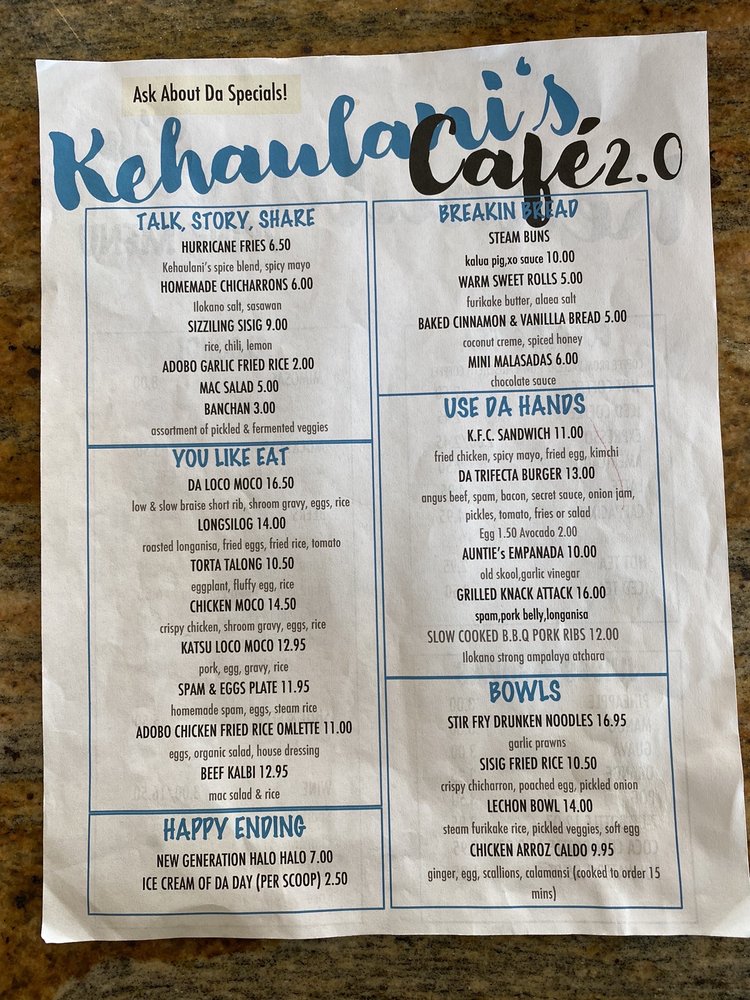 Kehaulani’s Cafe Menu